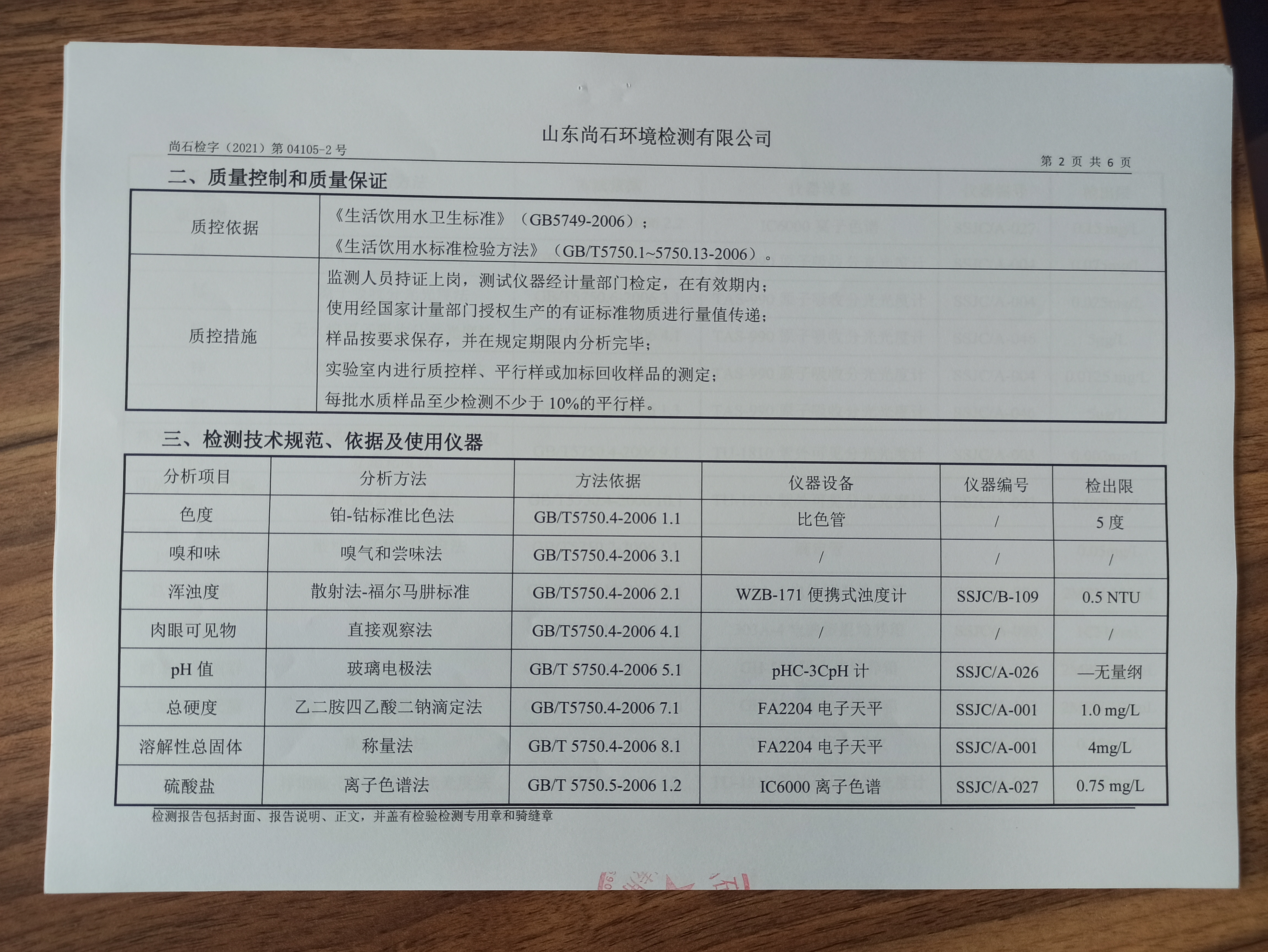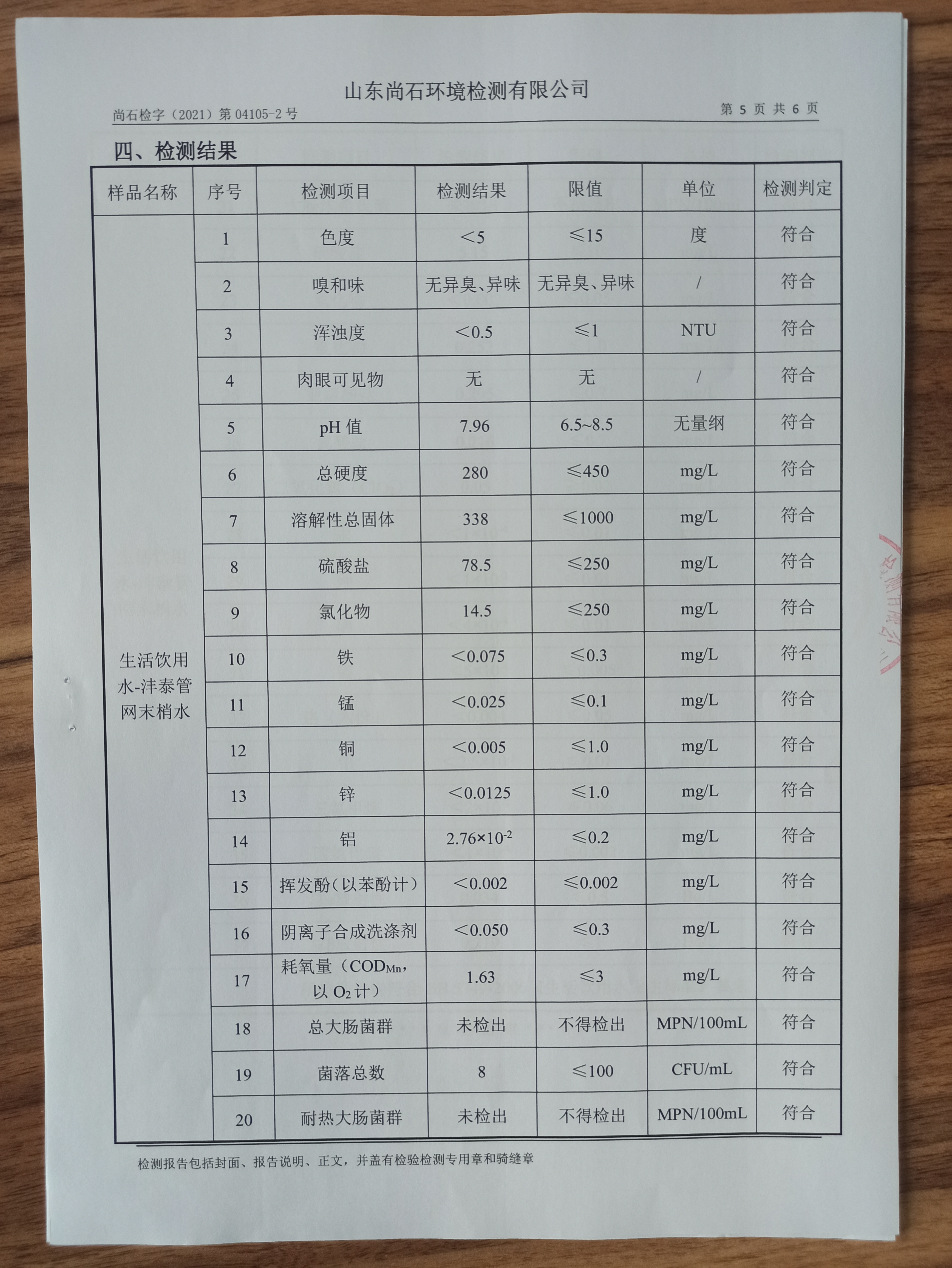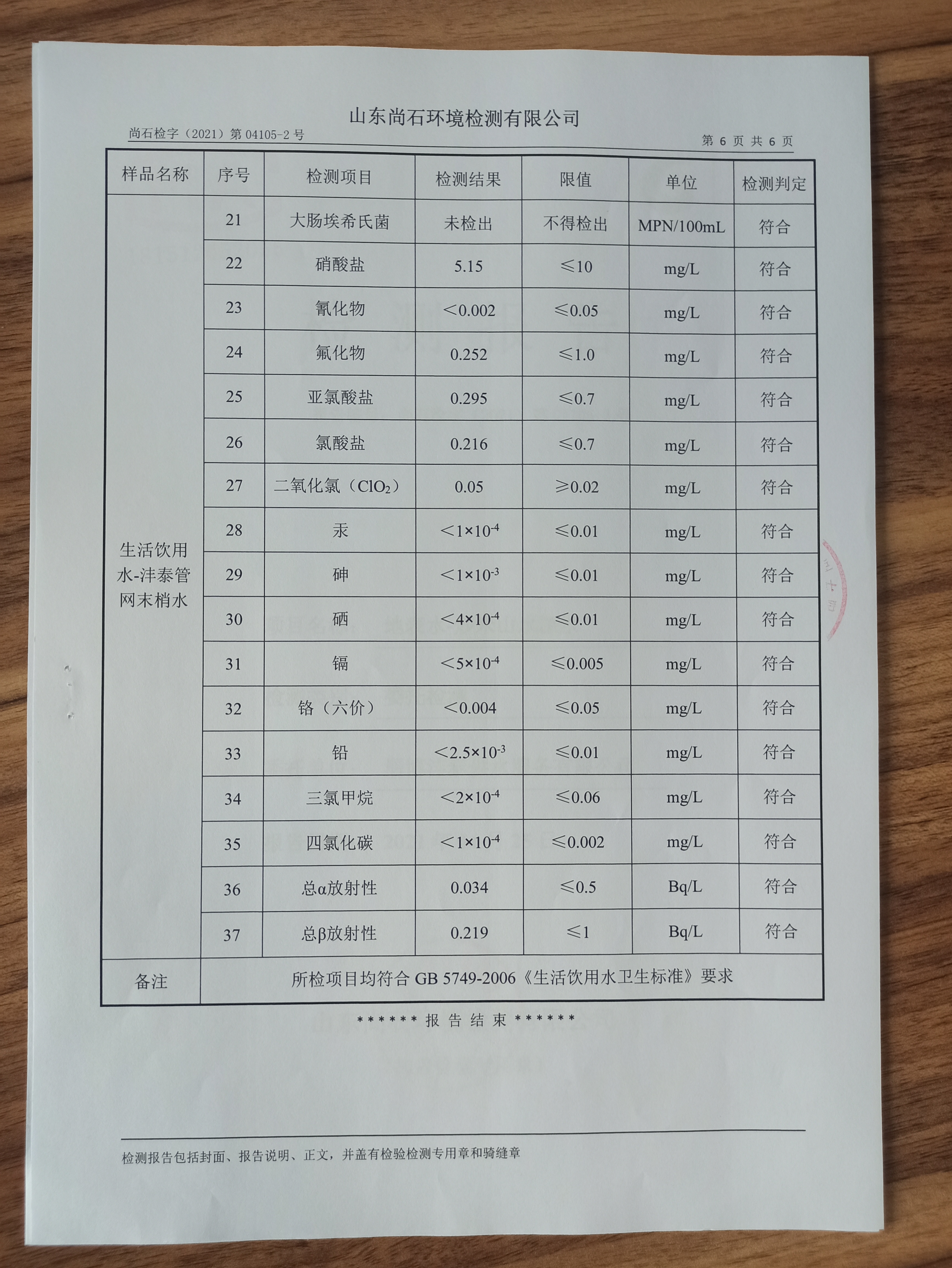 淄博灃泰供水服務有限公司管網(wǎng)水月檢報告